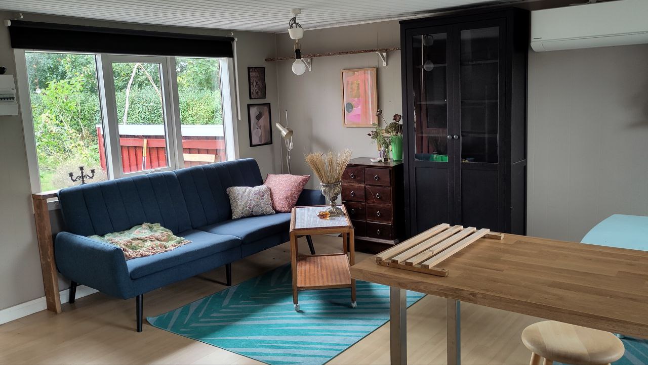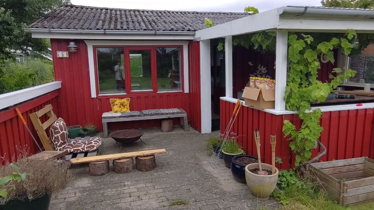 – 36 m2 med stue/køkken, soveværelse, toilet, baderum. Derudover overdækket terresse, cykelskur og redskabsskur.