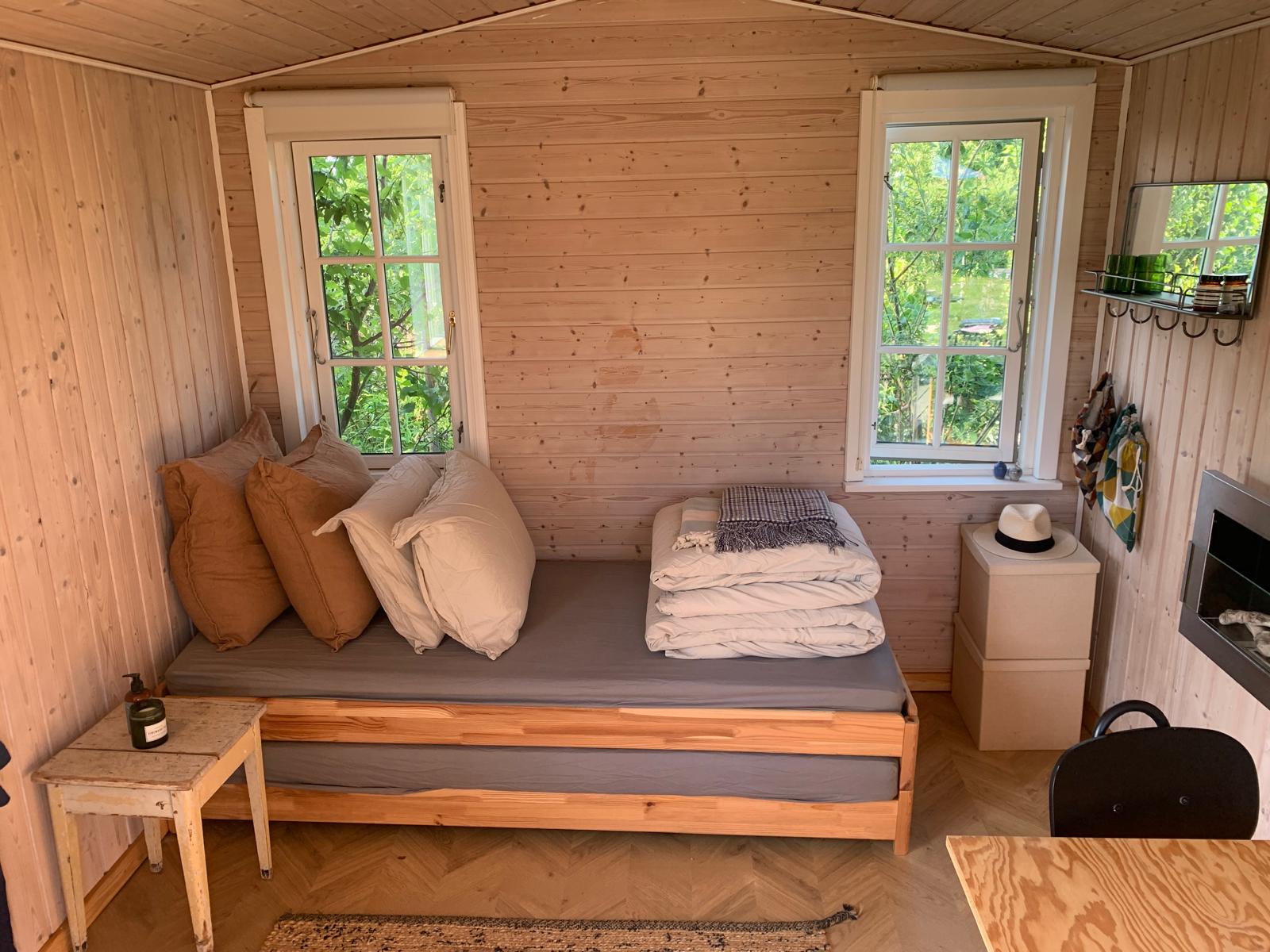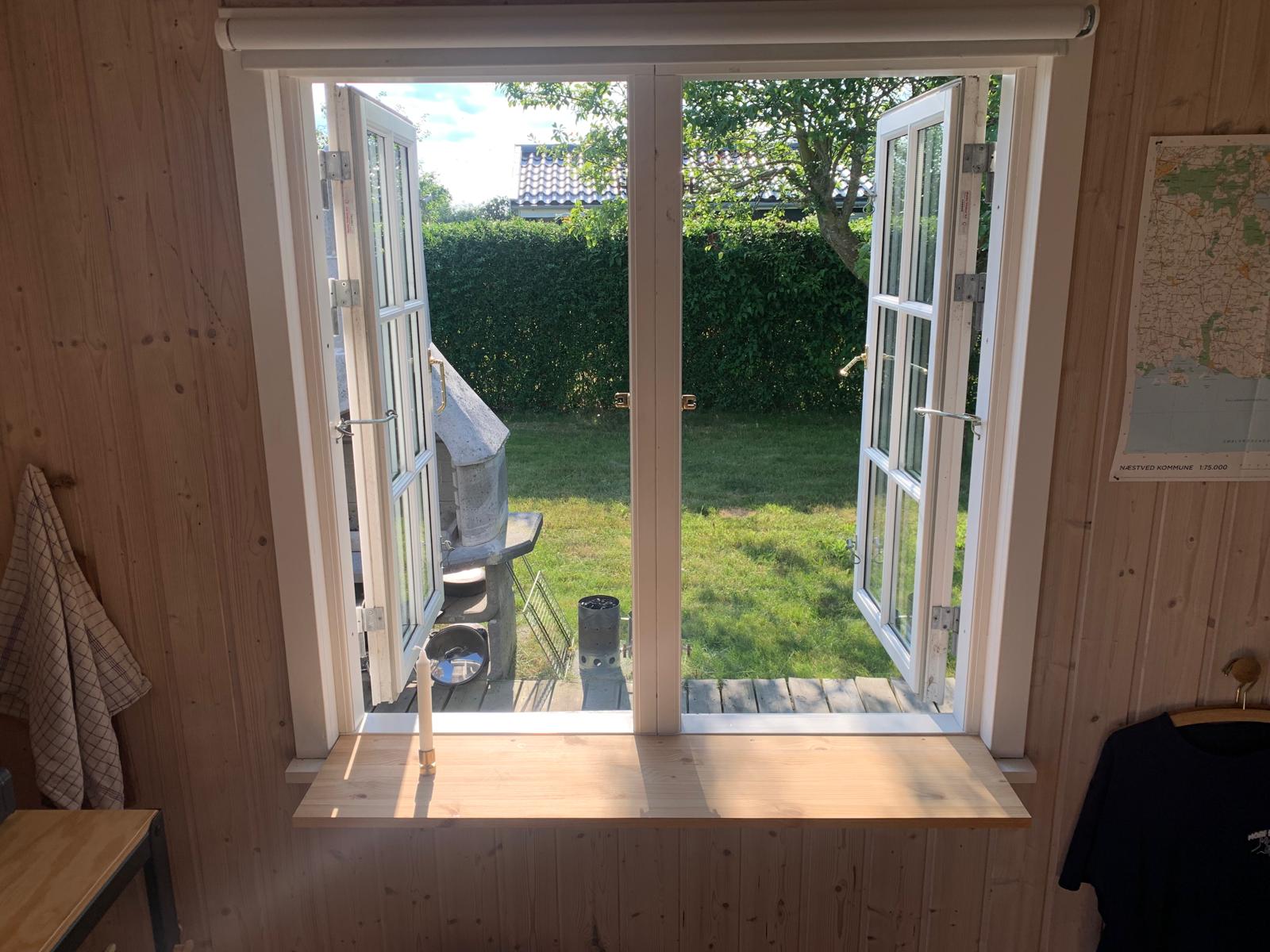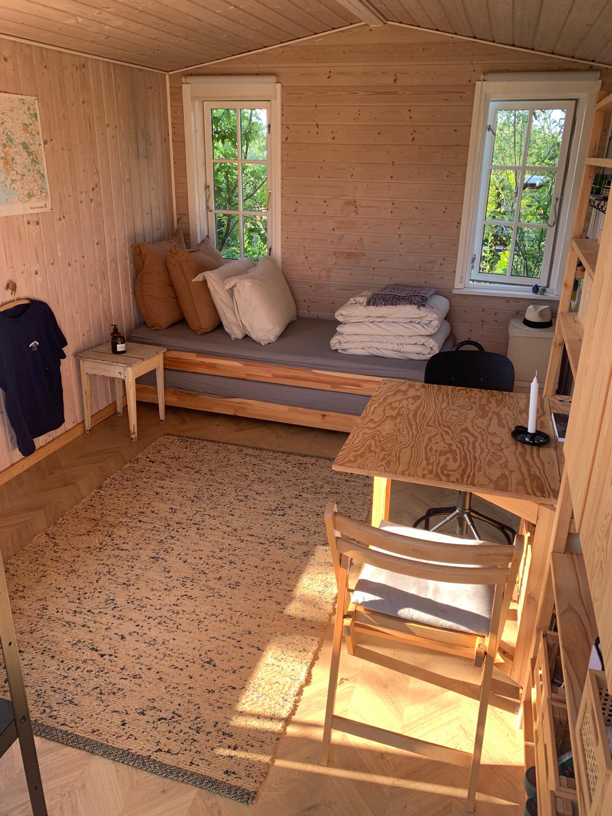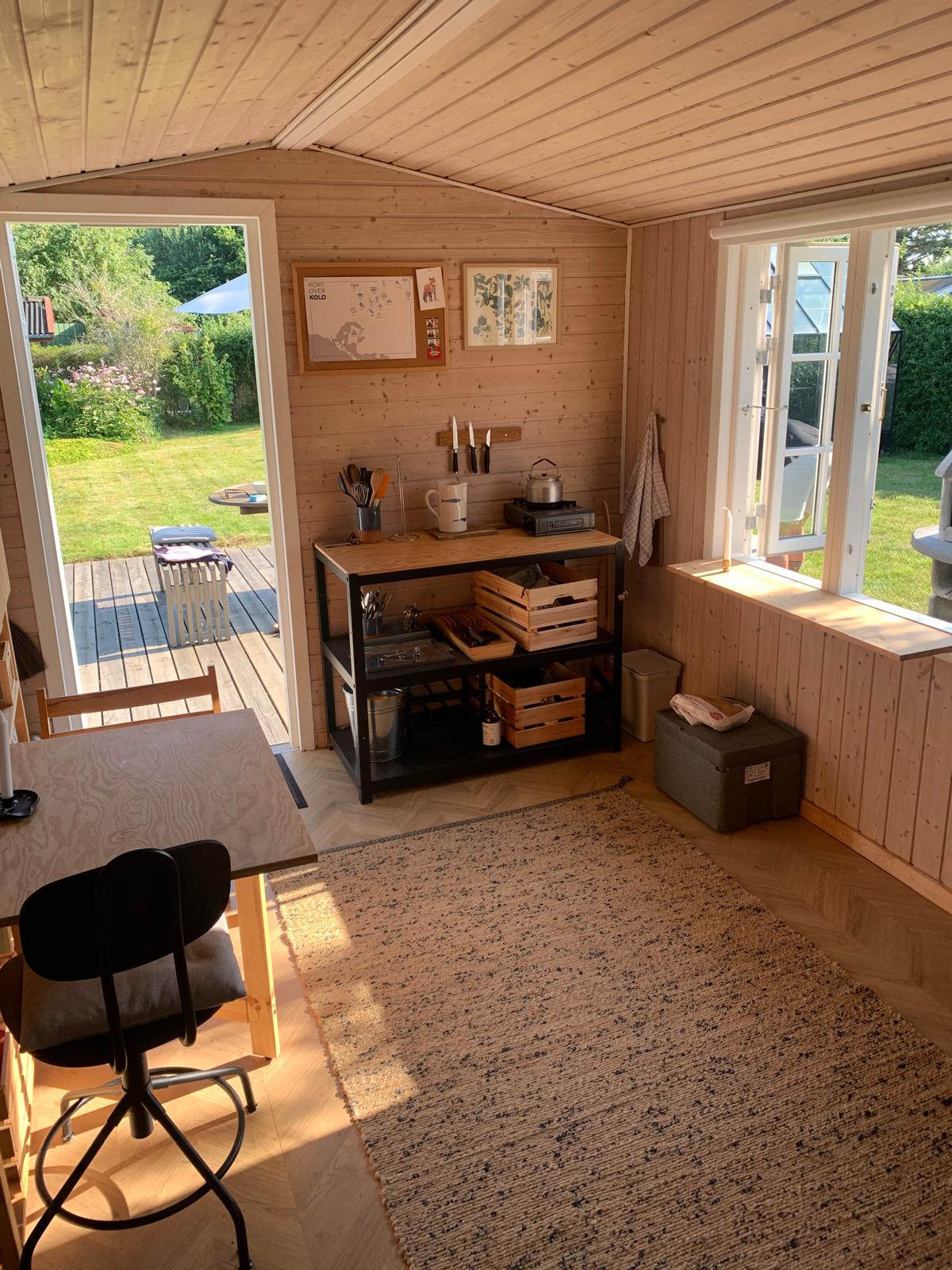 Huset fremstår lyst og indbydende med nyt gulv og en ny dør med vindue fra gulv til loft, som giver et dejligt lysindfald. Indretningen er enkel og funktionel med slå-udseng, reol og lille køkken – alt i lyst fyrretræ. Relativ nyt og velholdt. Udenfor får du to terrasser, et drivhus med fliser og et godt, rummeligt skur.