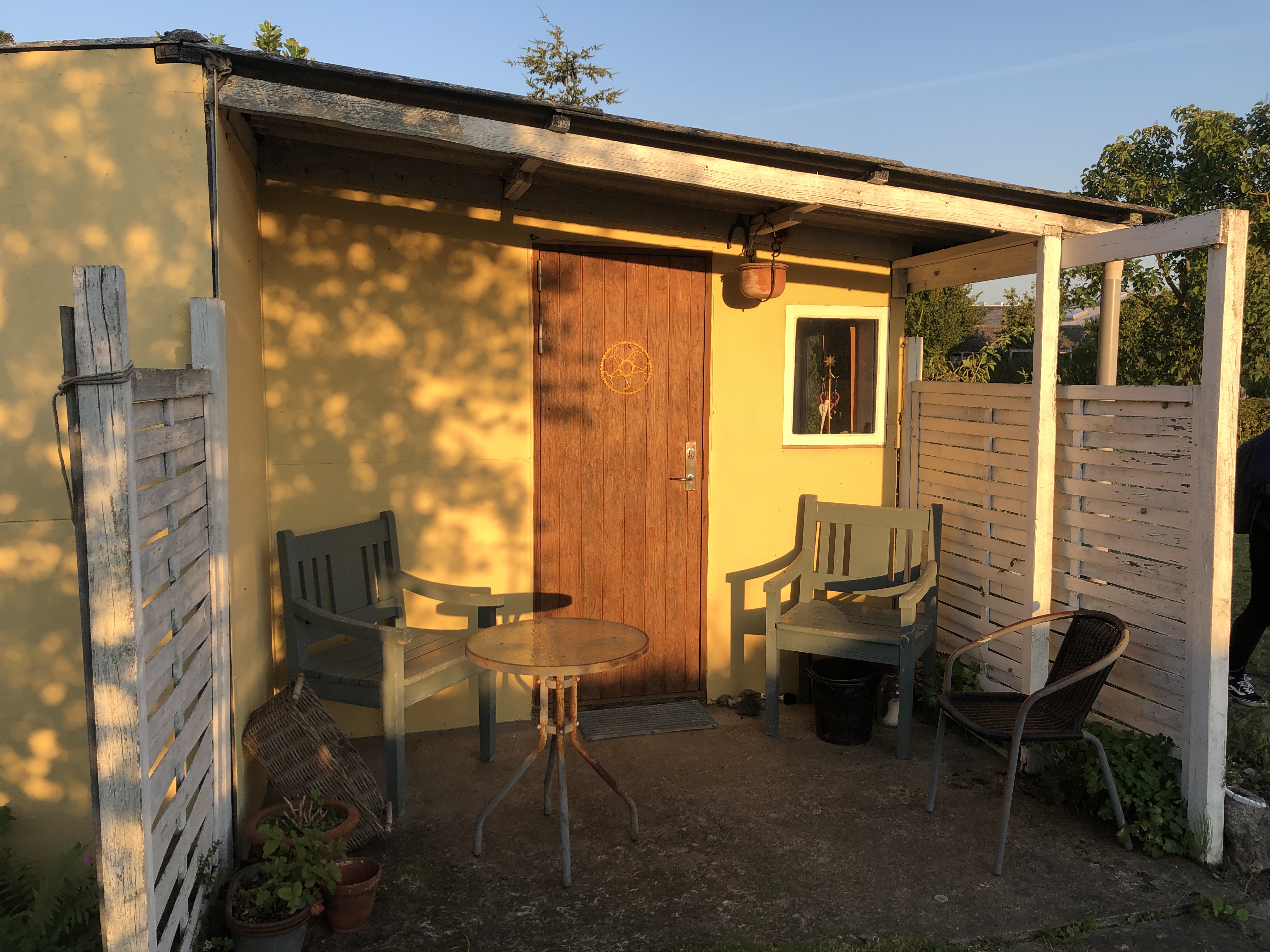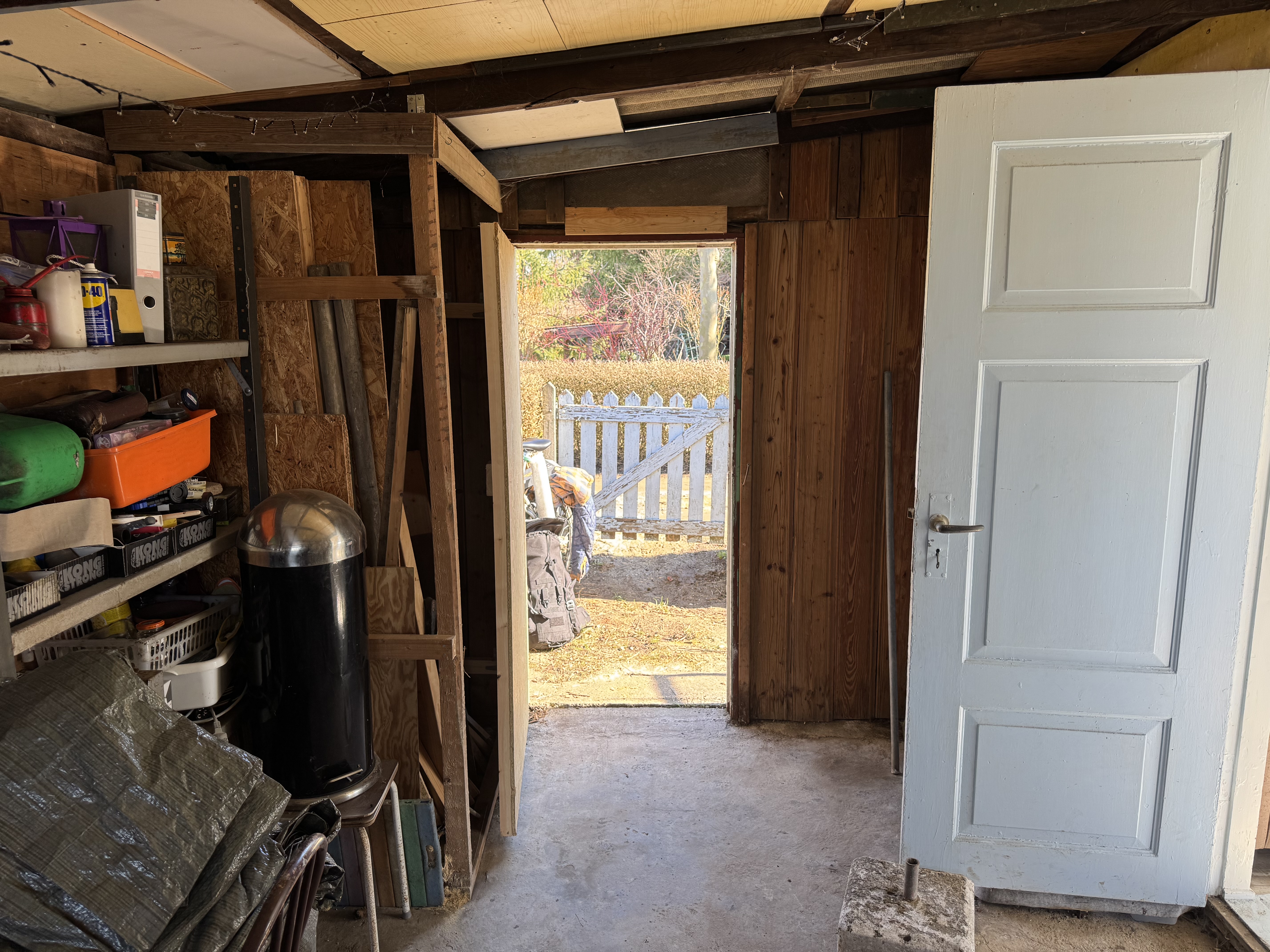 Huset, opført i 1955, er lavet af eternitplader med tynd isolering. Der er ikke strøm. Vi har to regnvandstønder og vandtilslutning i haven.
