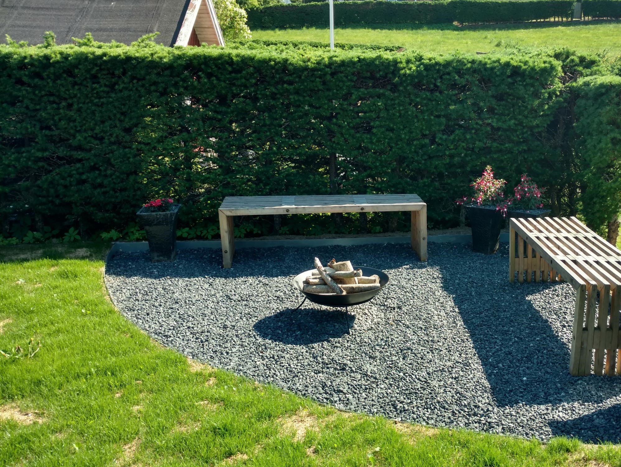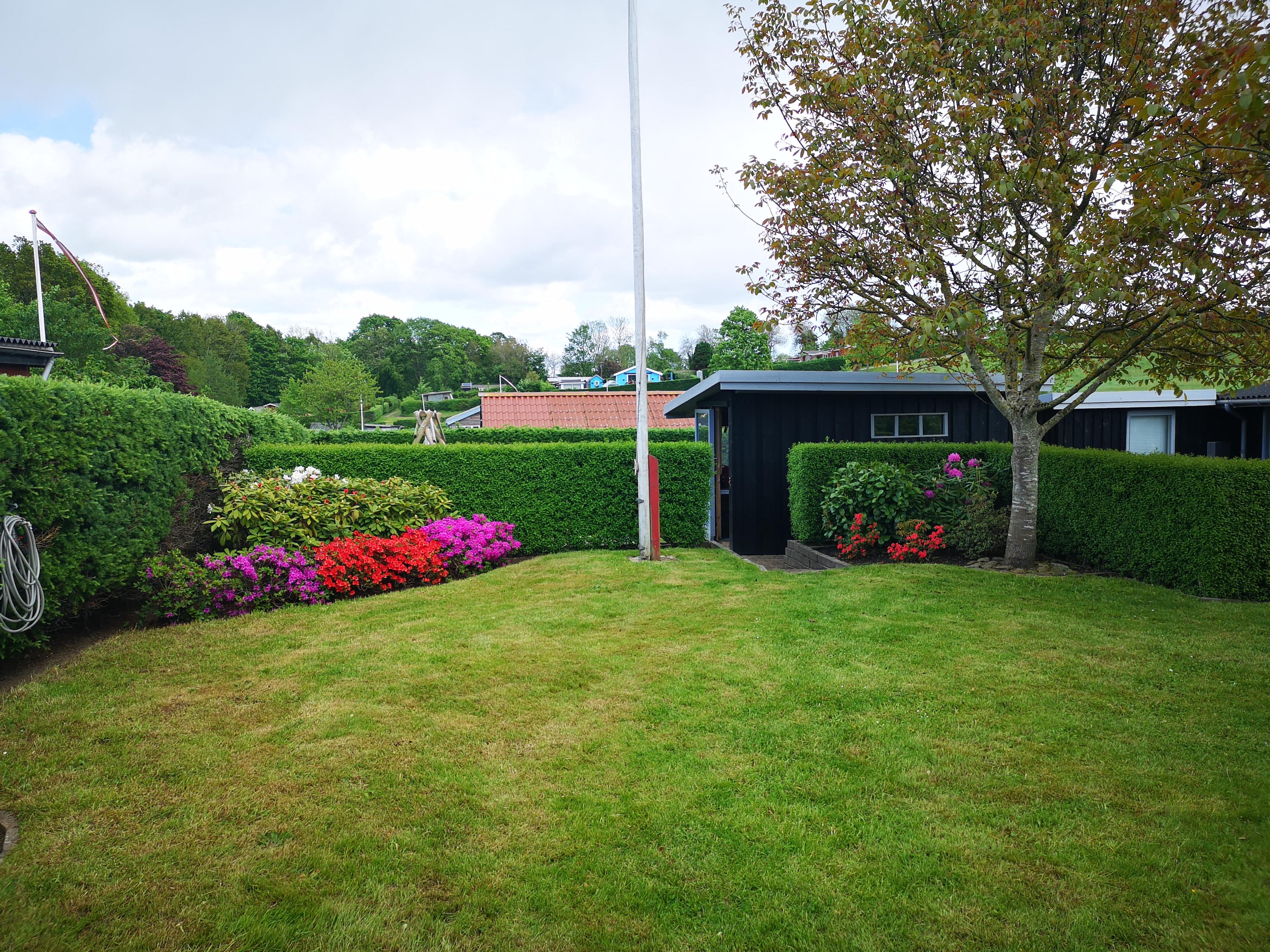400 m² grund, smukt opdelt i fire områder: bede med valnøddetræer, legeområde, solrig terrasse og græsplæne med klatreroser og bålfadsplads. Haven ligger fredeligt ned mod skoven, med god afstand til naboer, sol det meste af dagen og