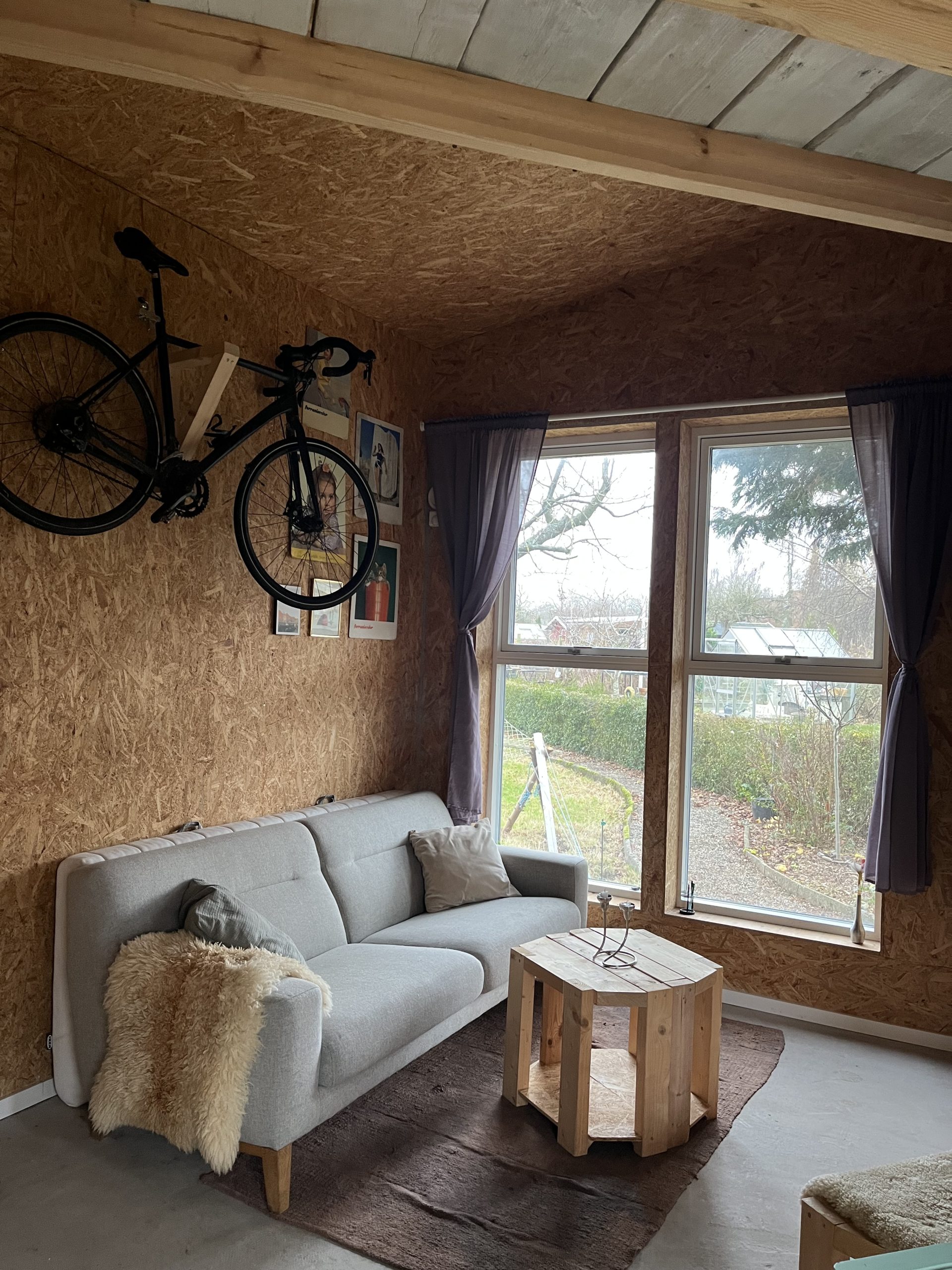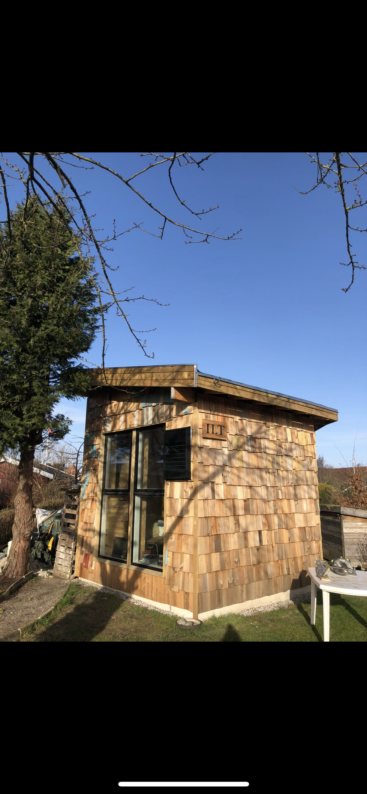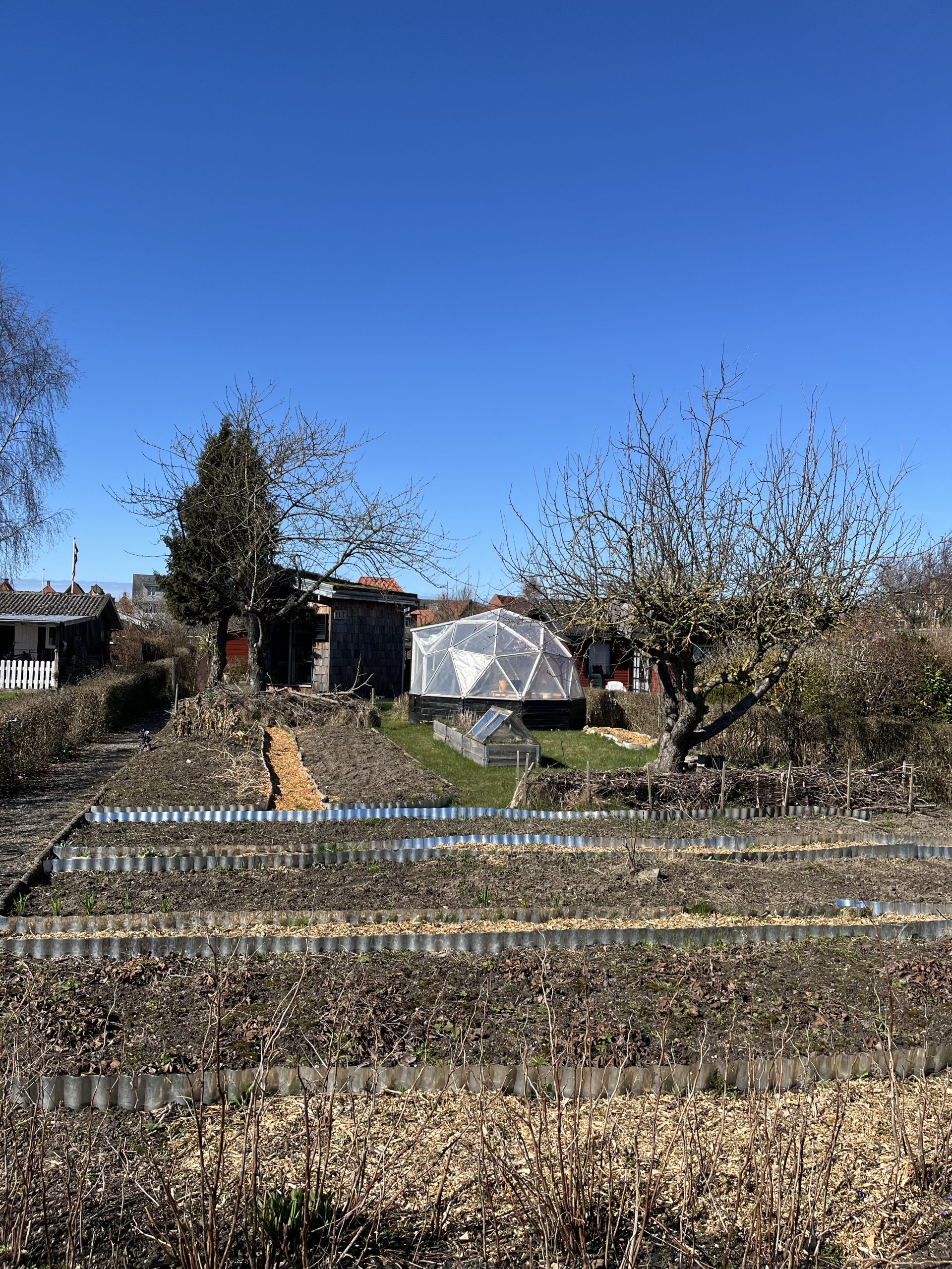 – Skur + unikt drivhus med siddeplads og mulighed for dyrkning