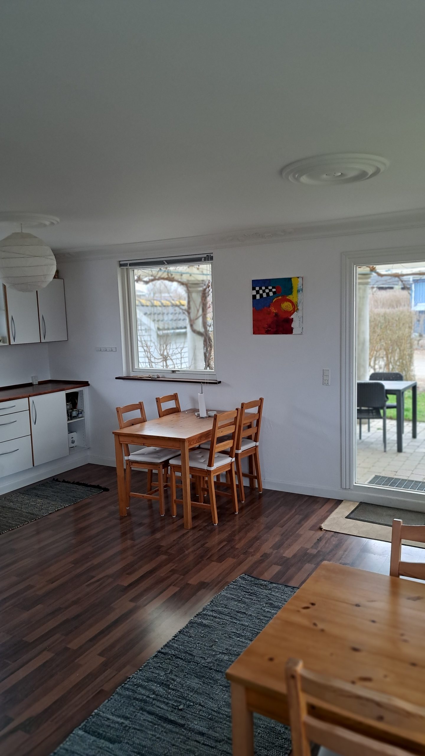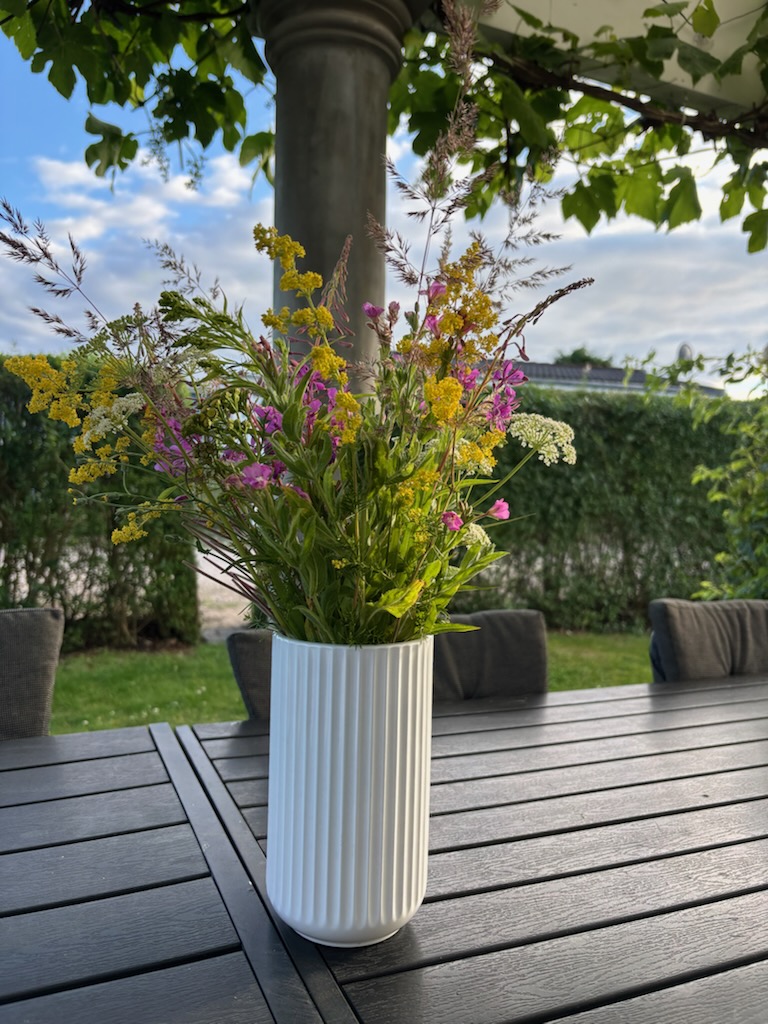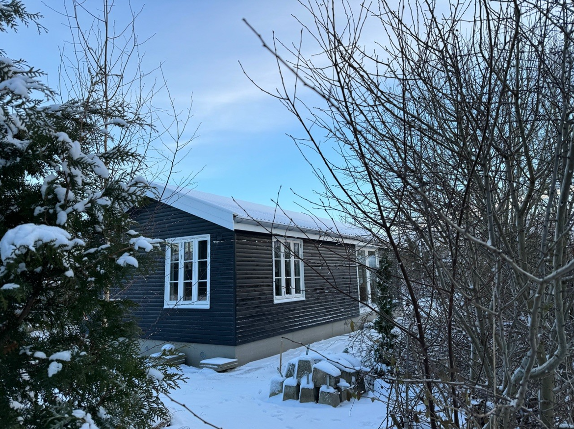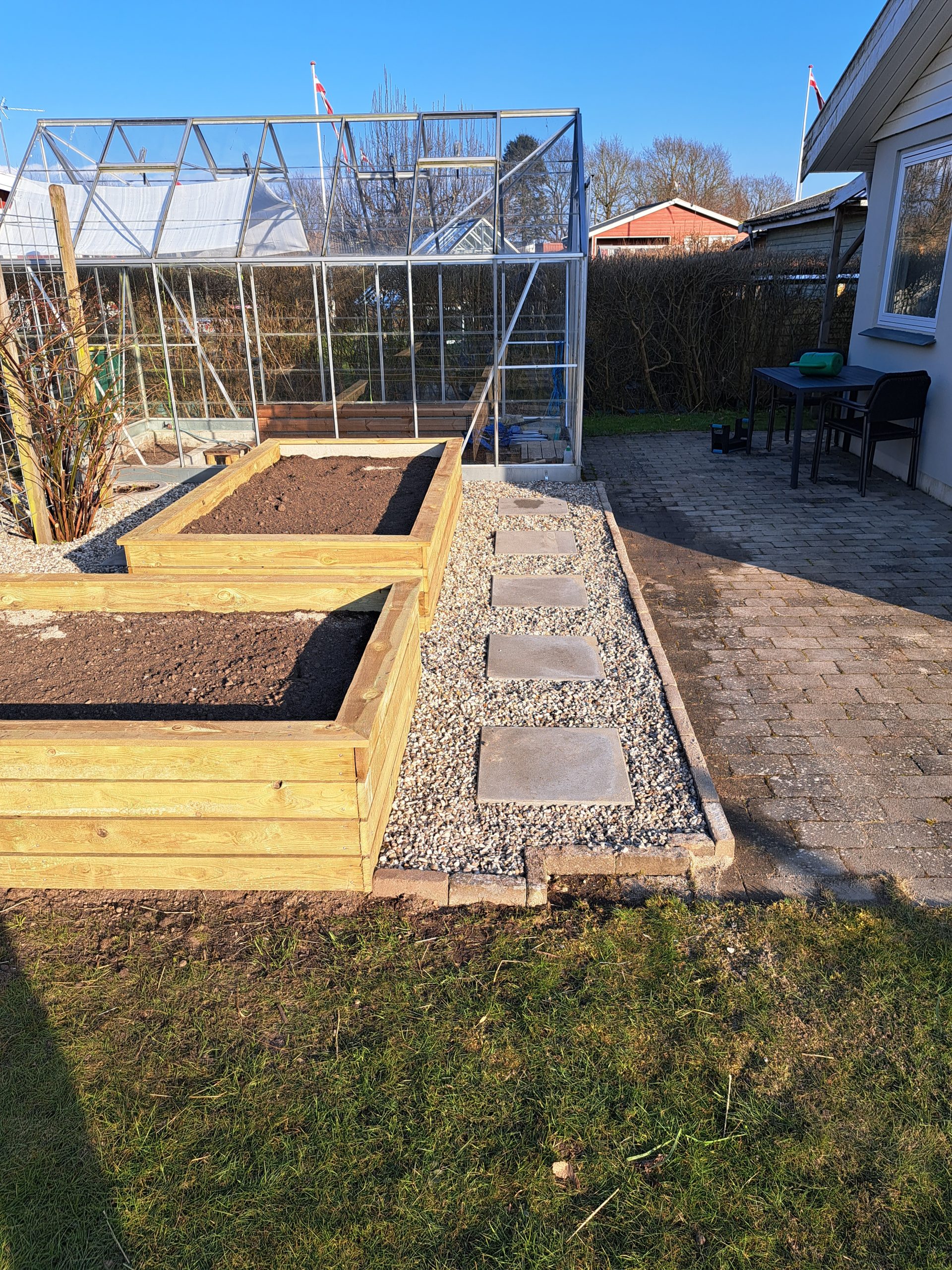 opmuret havehus med pudsede vægge og stuk monteret indendørs. 3 søjler støtter overdækningen, hvor vinplanten snor sig rundt i bedste græske stil