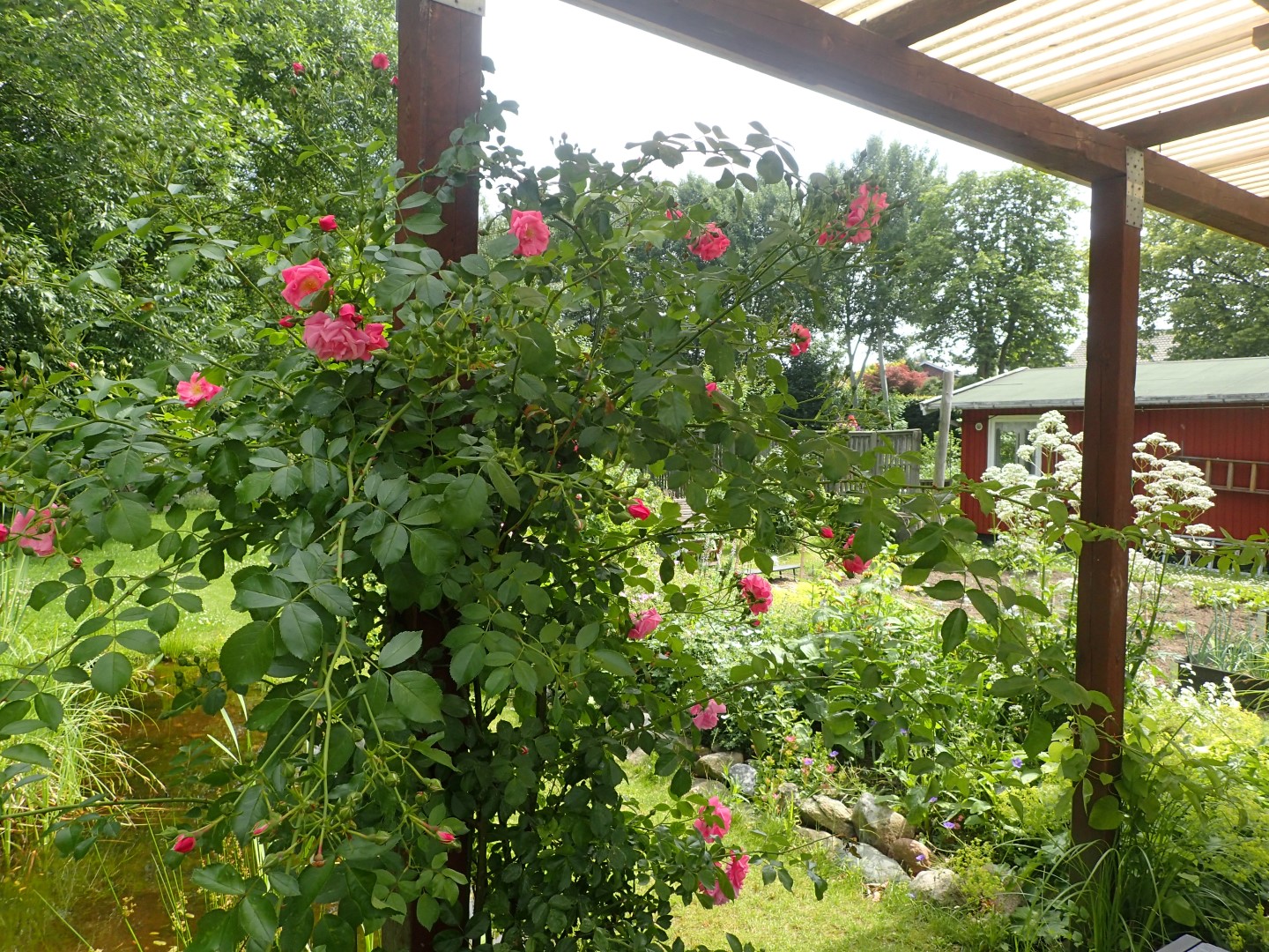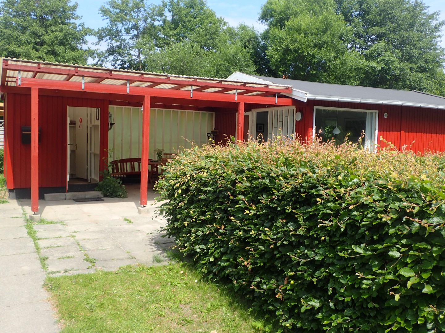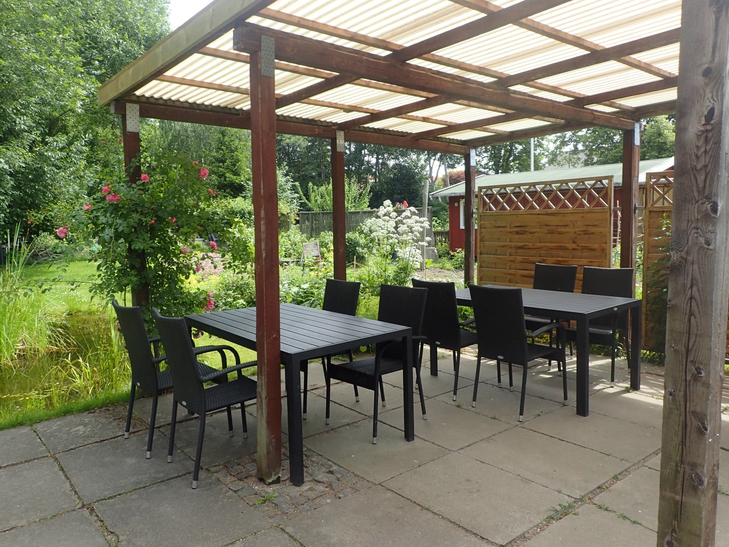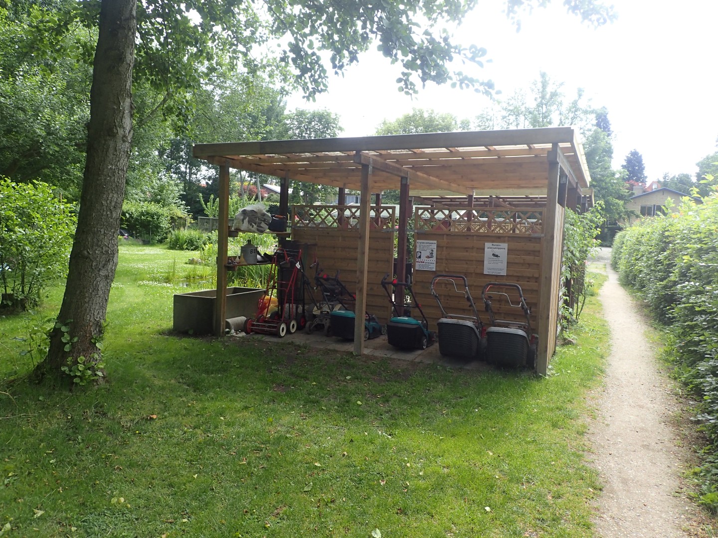Vi har et fælleshus med opholdsrum, køkken og toilet samt P-plads, grønne fællesarealer med borde og bænke samt små hyggelige huse til opbevaring af fælles redskaber.